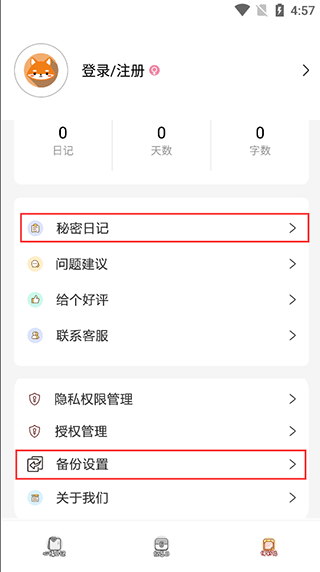 【便利贴】页面可以给日记设置密码、备份日记等。