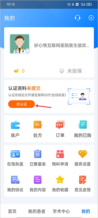 打开软件,在登录时通常需要进行医生认证。若未认证,则在进入软件首页后转至“我的”界面。