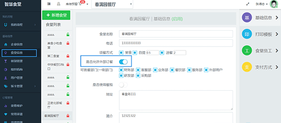 食堂信息,食堂的基础信息处,开启“是否允许外部订餐”。