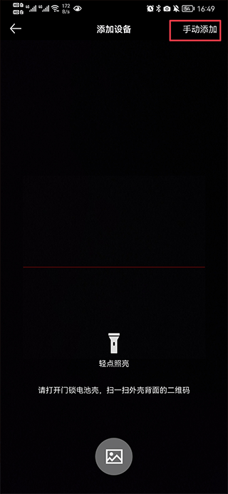 二、开启门锁电池盖,扫描背面的二维码即可绑定设备。若无法扫描,可点击右上角进行手动添加设备。