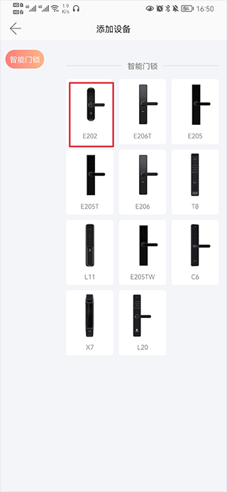 三、手动添加:选择智能门锁型号,如E202