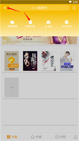 1、打开软件,点击左上角的“+”按钮,然后点击“本地书库”选项