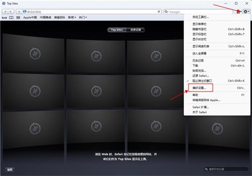 1、开启Safari浏览器,找到右上角的齿轮模样的图标点一下,再点击下拉菜单里面的“偏好设置”这个选项。
