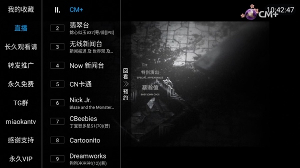 打开秒看电视后,我们能看到如下的界面,它会自动选取一个电视频道开始播放。