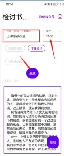 软件特色1、输入指定的关键词即可生成检讨书,满足不同用户的个性化需求。