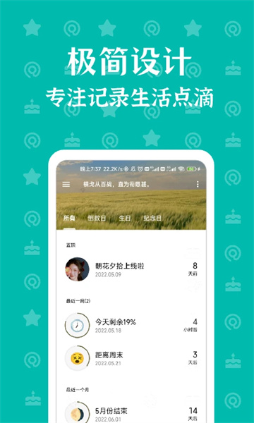 朝花夕拾App是一款非常温馨且实用的生活记录软件,用户可以在此应用中详细记录日常生活的点滴。软件界面简洁,功能丰富,提供多种实用记录工具,例如倒数日、纪念日和生日等重要时刻的提醒。此外,该软件还支持桌面小部件和云同步功能,让用户能够随时随地记录并分享生活中的精彩瞬间。有兴趣的朋友不妨下载朝花夕拾App体验一番。