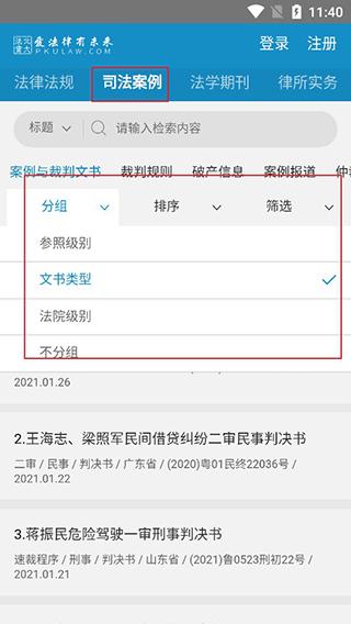 点击司法案例,你可以按照分组、排序、筛选等选择你需要的文献;