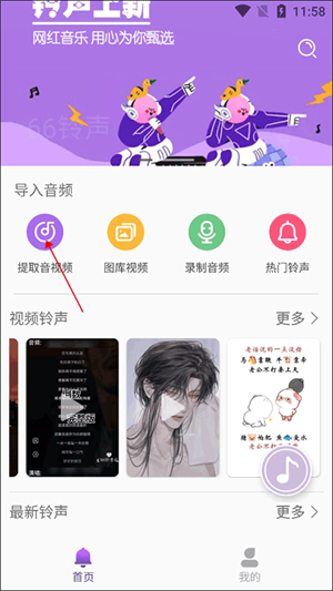 首先我们先进入到66铃声的主页,可以看见主页上方就有提取音视频的功能,我们点击它。