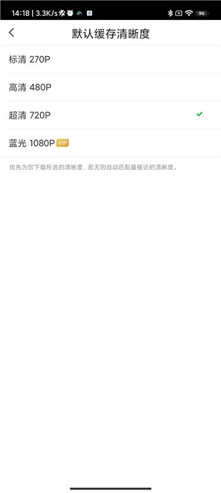 选择后自动返回,打开如下图界面,可以看到默认缓存清晰度已经设置成自己选择的了,这样就设置PP视频app下载视频的清晰度了。