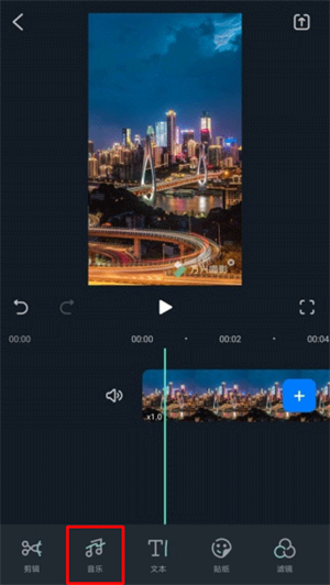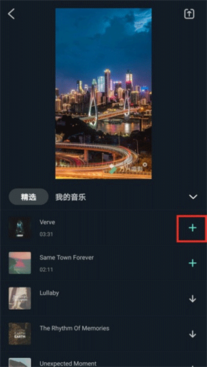 然后会弹出海量的音乐,选中我的音乐,就能够看见在自己本地中的音乐文件,也可以选择软件中带有音效,下载后在点击“+”号就能够添加。