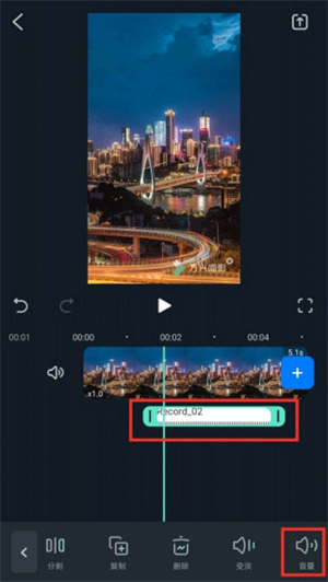 选中视频下方音频,用户可以在音频上进行分割,控制音频在视频出现的时间和结束的时间,在右下方音量图标,控制音频在视频中的声音大小,还有淡入淡出的音频效果可供选择。