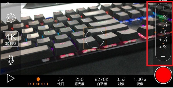 如图,在下面一栏中,包括快门、感光、白平衡、对焦、变焦等参数,我们可以选择更改调用,