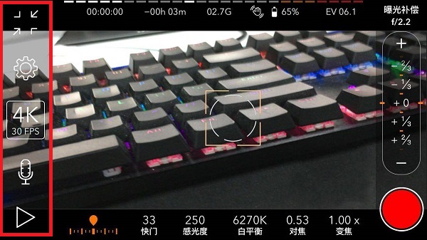 进入拍摄界面,包括缩放屏幕、设置、4k30fps、录音和播放等选项,用户可根据需求选择使用,