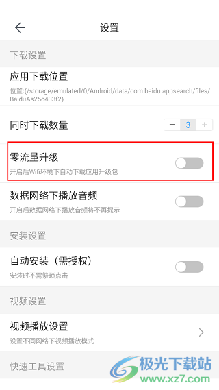 3、单击以打开“设置”窗口,随后在此处寻找“零流量升级”选项,并最终开启该选项右侧的开关按钮。