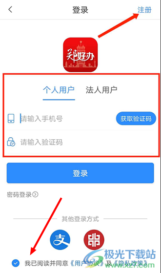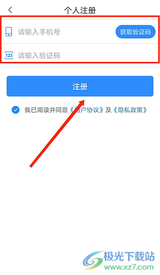 3、然后在“个人注册”界面中,输入手机号和验证码,勾选“我已阅读并同意”,最后点击“注册”按钮就可以了。
