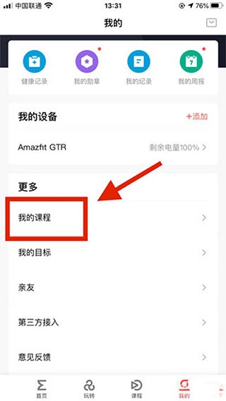 2、切换到个人中心界面中,我们点击“更多”一栏中的“我的课程”选项,如果还没有添加课程的话,点击右上角的“添加课程”按钮。