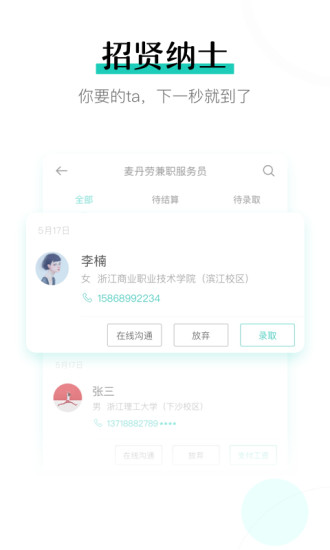 青团兼职商户版App是专门为招聘企业设计的招聘事务管理应用,与之相连的是青社团招聘学生端。平台上每天都有大量求职者浏览信息,学生可以随时投递简历。对于企业而言,他们可以随时在线编辑和发布招聘信息到平台,并能实时查看投递简历学生的详细信息。