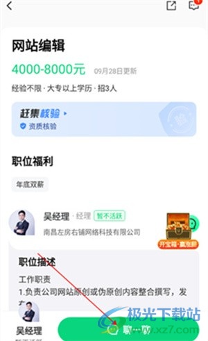 2、点击您感兴趣的工作可查看其详细信息,包括工作内容、学历要求、公司详情等,并能选择与招聘方互动交流。