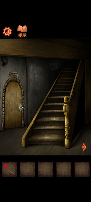 上楼点击201房间右边的灯的开关,开灯后从右下角桌子下方的红色绣鞋下获得钥匙。