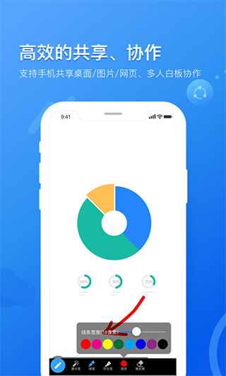 支持共享屏幕、文档、图片、网页,支持电子白板协作、书签、云录制,会议互动管理等功能。