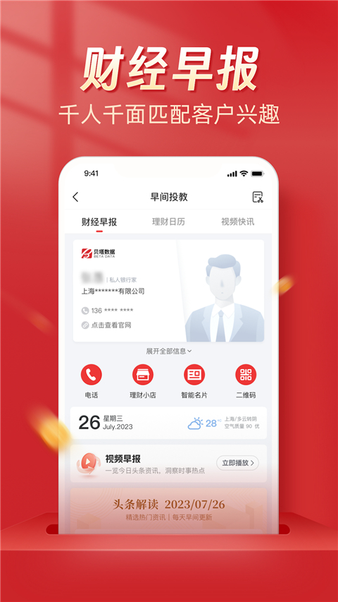 市场陪伴及解读:7×24小时不间断提供早间投教、短视频、热点解读等营销素材,帮助金融顾问和理财师打造专业且生动的人设,增强朋友圈的差异化竞争力。例如,【财经早报】功能根据客户偏好生成专属早报和专业点评,并通过文字、视频、音频等多种形式呈现,让客户在轻松愉快的氛围中获取最新财经资讯。
