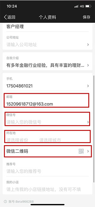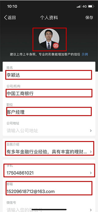 第四步:点击上面的头像框设置头像,这个头像将是个人名片的头像,随后输入下面各类信息,姓名、单位、职位、自我介绍、联系方式等信息,方便客户及时联系我们;