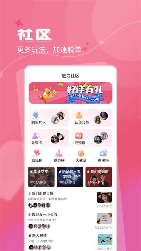 在这里,您可以与同城单身美女帅哥们在线聊天,互相好感喜欢,趣味语音互动,视频交友约会,姻缘树下求姻缘,还能24小时抛绣球噢。此外,软件还提供了丰富的社交活动,如线上派对、主题讨论等,让用户在轻松的氛围中结识更多志同道合的朋友。通过这些功能,用户可以更全面地了解对方,找到真正适合自己的另一半。