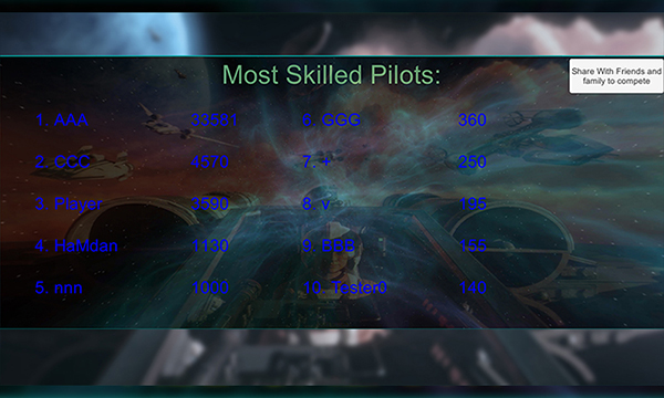 游戏结束后,系统会展示10名最熟练的飞行员,也就是游戏得分前10名的玩家。想要让你的名字登上排行榜吗?那就赶快加入游戏,展现你的射击技巧吧!