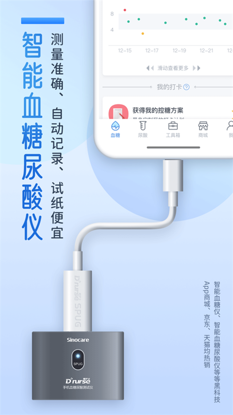 还有全球首款通过CFDA认证的手机智能血糖仪搭配使用。