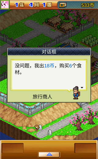 与旅行商人交互,用币购买食材,储备基础资源用于商品生产。