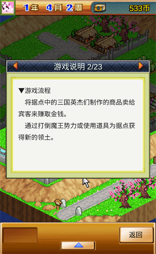 核心玩法是让武将制作商品卖给宾客赚金币,击败魔王势力或用道具扩张领土,逐步壮大村庄。