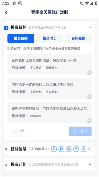 依次填入投资目的、投资时长、目标金额