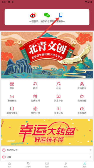 登录成功后,进入APP首页,能看到北青文创等板块,还有签到、摇奖等功能入口,可参与相关活动。